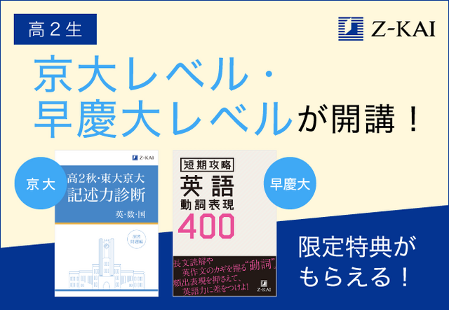 Z会は難関大現役合格に向けた学習をスタートする高2生の方を応援するため、高2生向け「京大レベル」「早慶大レベル」を新規開講しました。