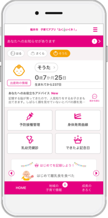 福井県福井市に採用された『福井市 子育てアプリ「ふく👍いくネ!」』は、スマートフォン・タブレット端末・PCに対応したサービスで、妊産婦と子どもの健康データの記録・管理や予防接種のスケジュール管理、出産・育児に関するアドバイスの提供、離れた地域に住む祖父母など家族との共有機能や、市が配信する地域の情報をお知らせするなど、育児や仕事に忙しい母親や父親を助けてくれる便利な機能が充実しています。