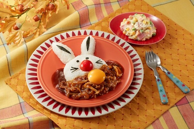 9月のイベント献立はお月見をイメージし、うさぎ風に盛り付けたライスの上に月に見立てた卵をのせてつくる「お月見ハヤシライス」をお届けします。ライスはうさぎ以外にも海苔で自由に飾りつけができます。副菜として、さつま芋の甘さの中にほんのりカレーが香る「さつまいもサラダ」もご用意しました。