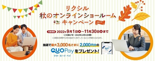 株式会社LIXIL(以下LIXIL)は、LIXILオンラインショールームを初めてご利用される方を対象にした「LIXIL 秋のオンラインショールームキャンペーン」を、9月1日(木)から11月30日(水)までの期間、全国で開催いたします。初回新規で、LIXILオンラインショールームの「予約してオンライン相談」をご利用いただき、2回目に「予約してオンライン相談」をご利用、もしくは、「ショールームへご来館」いただいたお客さまの中から、抽選で最大3,000名に2,000円分のQUO Pay(クオ・カード・ペイ)をプレゼントいたします。