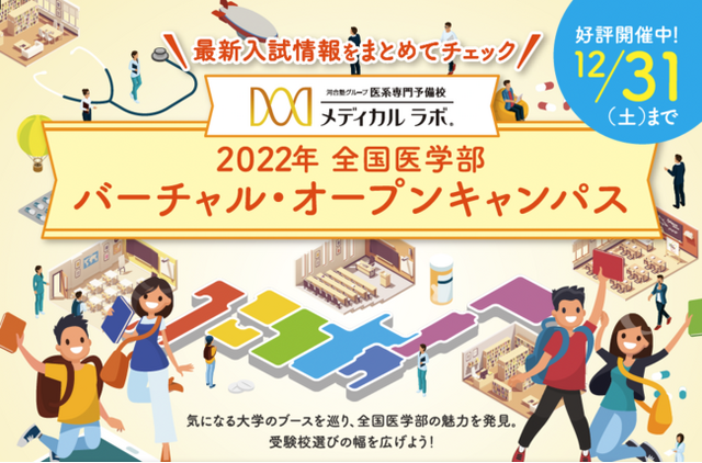 医系専門予備校として合格者数No.1(※「株式会社ドゥ・ハウス」調べ/2022年度入試 医学部医学科合格者1,270名)、全国に28校を展開する医系専門予備校メディカルラボ(河合塾グループ)は、受験生・保護者への情報提供の場として、この度、全国医学部の最新入試情報をいつでもどこでもチェックできる「2022年 全国医学部 バーチャル・オープンキャンパス」を開催。メディカルラボ独自取材のインタビュー動画や大学案内動画、キャンパスツアーや入試説明資料等をご覧いただくことで、全国医学部のオープンキャンパスを一度に体験いただけます。