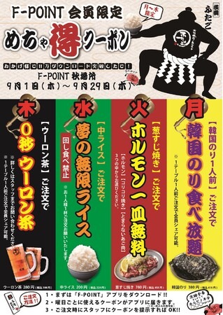 株式会社FTG Company(本社:東京都目黒区、代表取締役社長:李 純哲)が運営する「大阪焼肉・ホルモン ふたご」は、月曜日から木曜日の日替わりでF-POINT会員様限定の「めちゃ得クーポン」を配信します。9月1日(木)~29日(木)まで曜日ごとに異なるお得なサービスを提供します。