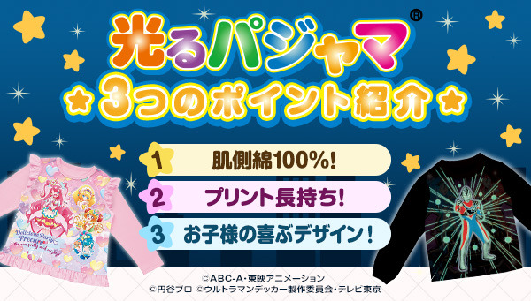 「光るパジャマ」シリーズは、太陽光や蛍光灯などの光を吸収し、暗い場所で一定時間発光する「蓄光プリント」の技術を用いたパジャマです。キャラクターを「蓄光インク」でプリントしたパジャマで、「暗いところが怖い」というお子さまの声と、「夜なかなかパジャマを着てくれない」という親御さまの声から生まれました。