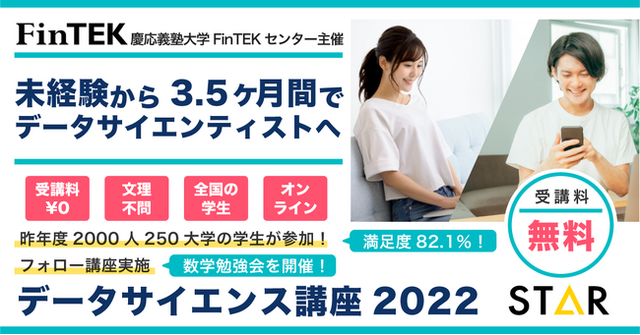 フィンテックに関する認知・理解度向上及び人材育成をミッションとする、慶應義塾大学経済学部附属経済研究所FinTEKセンター(以下、FinTEKセンター)(東京都港区、センター長 中妻 照雄)は、無料の「慶應義塾大学FinTEKセンター データサイエンス講座 2022」(オンライン)を、昨年に続き今秋も開催します。昨年、この講座には2,000名以上の学生が全国250の大学・大学院・専門学校から文理問わず応募し、1,400名以上が受講しました。