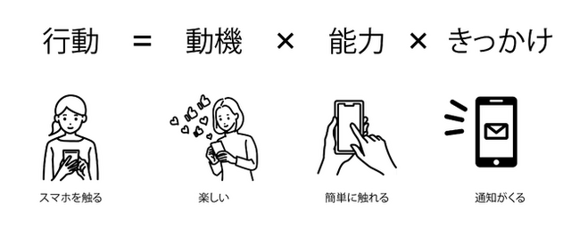 BJフォッグ氏が提唱する行動デザイン理論では、人の行動(Behavior)が3つの要素「行動に対するモチベーション(Motivation)」「行動するための能力(Ability)」「行動を起こすきっかけ(Prompt)」)に起因するとしています。そして、人が行動するためには3つの要素が全て同時に揃う必要があり、逆に人が行動しない時にはこれらの要素の何れかが不足しているとしています。