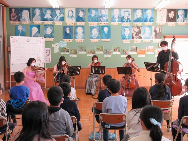 授業では、主に4年生を対象とし、音楽を通じた自己表現やコミュニケーションの楽しさを感じてもらえるよう、生演奏を聴くだけでなく、楽器の仕組みや奏法、音楽の歴史など、多角的に音楽を学ぶための工夫をしています。今年度は「弦楽五重奏」「管弦五重奏」「金管五重奏」「木管五重奏」の4編成で実施します。