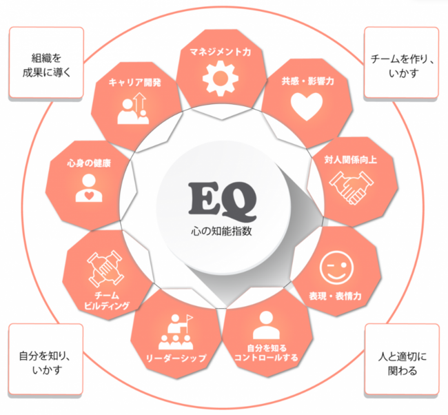 EQとは、Emotional Intelligence Quotientの通称で感情知性のことを指します。1990年に米国の2人の心理学者によって論文として発表された理論で、「自己の感情や思考をマネジメントするとともに他人や周囲の感情を適切に理解し働きかける能力」。自分の感情を理解し、周囲に適切に対応するスキルとして注目が高まっており、生涯を通じて開発できることが特徴の一つ。