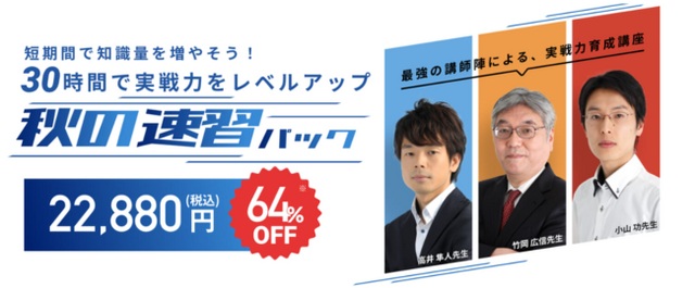 「秋の速習パック」では、この時期に受験対策のメインとなる問題演習を中心とする講座を、科目別でパッケージ。授業30時間・受講期限30日で効率的に学習できる、「速習」のための講座構成でお届けします。価格も大幅にプライスダウンさせた、取り組みやすい特別価格でのご提供です。