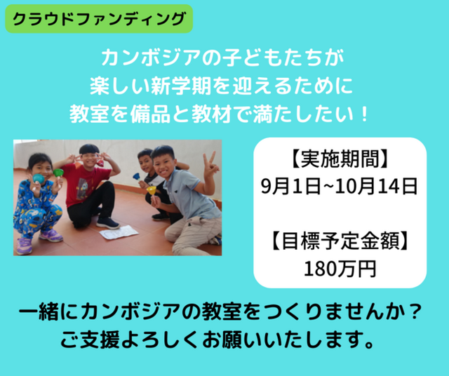 進級します。子どもたちが学ぶ教室に必要な教材や備品を揃え、豊かな学びの場をつくるために、クラウドファンディングを通じて、皆様からの幅広く支援をいただきたいと思います。