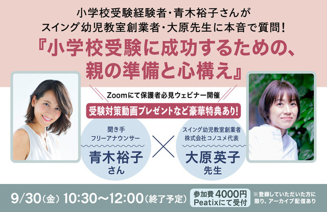 教えてくださるのは、慶應幼稚舎や早稲田実業初等部など名門小学校に多数の合格者を輩出した『スイング幼児教室』を立ち上げ、現在は小学校受験専門オンラインサロン『コノユメ』を主宰している大原英子先生です。そして、2人のお子さんの小学校受験を体験したフリーアナウンサーの青木裕子さんにもご登壇いただき、保護者として、小学校受験をどう成功させたらいいのか、大原先生に本音で質問。小学校受験を検討中の方はもちろん、これから本番を迎える方も一見の価値ありです。