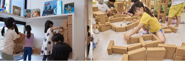 コルクは天然素材で、断熱・遮音・防水・弾力・軽量・絶縁性など多くの機能特性があります。安全性が重要視される保育現場におきましては、「軽くて丈夫、かつ安全に遊べる」玩具として需要を見込みこの度導入していただきました。たった一つの長方形のカタチが子どもたちの想像力をかきたて、また従来の積み木の倍以上の大きさにも関わらず軽さを兼ね備えているため、何個も持ち運び大きな基地が出来上がるなど、保育現場では、個々から集団あそびにも繋がる様子が伺えます。