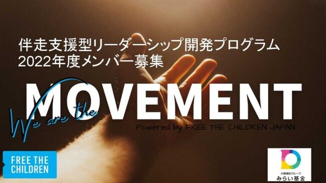 認定NPO法人フリー・ザ・チルドレン・ジャパン(所在地:東京都世田谷区南烏山6-6-5-3F、代表:中島早苗)は、ソーシャルアクション(社会貢献活動)に取り組みたい子ども・若者たちをサポートするプロジェクト「We are the MOVEMENT 2022-2023」の参加者(個人・グループ)を募集します(応募締切:9月12日(月))。書類・面接選考を通過した個人・グループは、活動を通してフリー・ザ・チルドレンのスタッフによる相談支援と活動資金の助成を受けることができます。「世の中のこんなところを変えたい」「これってちょっと問題じゃない?」社会課題を自分ゴトとして考えて、問題解決のための第一歩を踏み出す子ども・若者を応援します。本事業は「大東建託グループみらい基金」の協賛・助成により行われます。