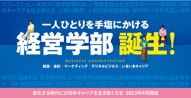 大手前大学は、2023年4月より経営学部を開設します。本学部の学びの目的は、実践と内省をくり返しながら、社会の幸福や持続可能な発展に貢献する人材を育成することです。幅広い学びを通じ、社会に出てからも成長を続け、100年キャリアを生き抜くための土台を築いていきます。