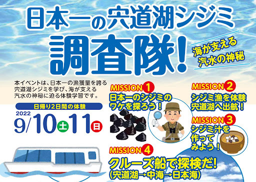 海と日本プロジェクトinしまね実行委員会は9月10日(土)、11日(日)に、小学5・6年生20人が、海と深い関わりを持つ宍道湖での体験を通し、湖や海の環境について考え、その環境保全につなげることを目指す体験学習「日本一の宍道湖シジミ調査隊」を開催いたします。このイベントは、次世代へ海を引き継ぐために、海を介して人と人とがつながる“日本財団「海と日本プロジェクト」”の一環です。