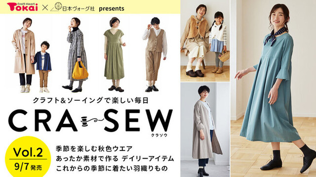 6月の創刊号(vol.1)に続けて発売する「CRA-SEW(クラソウ)vol.2」は、秋から冬にかけておすすめの手づくり作品を多数掲載。作品に使用する布や材料は全国のトーカイグループ店舗またはネットショップで購入できます。(お買物に使えるクーポン付き)