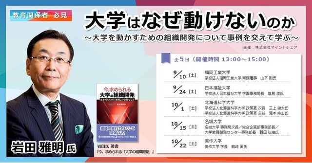 株式会社マインドシェア(本社:東京都港区)は、教育関係者に向けた有料のセミナー「大学はなぜ動けないのか~大学を動かすための組織開発について事例を交えて学ぶ~」を全5回にわたって開催します。