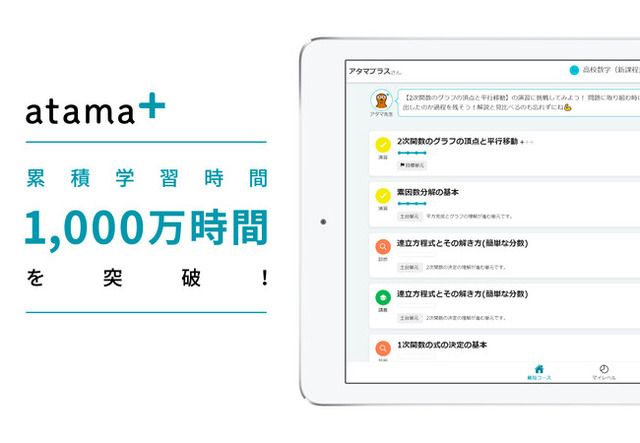 「atama+」は、膨大な学習データに基づいてAIが一人ひとりに合わせた「自分専用カリキュラム」を作成し、効率的な学習を提供するAI教材です。2017年7月に提供を開始し、現在は全国の塾や予備校3200教室以上で活用されています。この度プロダクトのリリースから約5年間で、atama+を使って生徒が勉強した総学習時間が、累積で1,000万時間を突破しました。