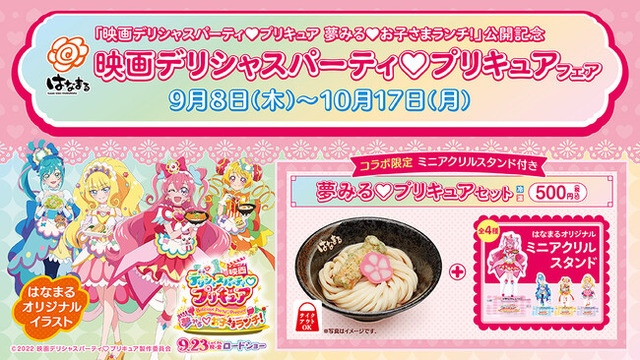 讃岐うどんチェーン「はなまるうどん」を展開する株式会社はなまる(本社:東京都中央区 代表取締役社長:前田良博、以下はなまる)は、2022年9月8日(木)より、全国の「はなまるうどん」「うまげな」「さぬき麺屋」「つるさく」他各店舗(※一部店舗除く)にて、『映画デリシャスパーティ(ハート)プリキュア 夢みる(ハート)お子さまランチ!』の公開を記念したコラボレーションとして、「映画デリシャスパーティ(ハート)プリキュアフェア」を開催いたします。