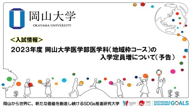 国立大学法人岡山大学(本部:岡山市北区津島中、学長:槇野博史)では、「2023年度医学部医学科(地域枠コース)の入学定員増について」、以下の通りお知らせします。