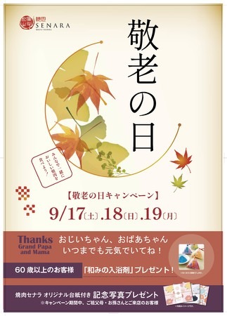 株式会社コーフク(本社:埼玉県さいたま市)の運営する焼肉店セナラでは、9月17日(土)・18日(日)・19日(月)の間、敬老の日キャンペーンを行います。