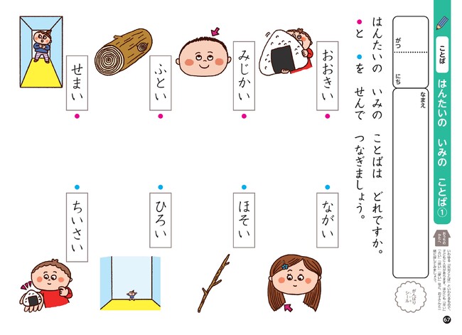 動詞や反対の意味をあらわす形容詞、「は」「を」「へ」(助詞)の使い方など、ことばに関する問題に取り組みます。助詞の使い方は最初につまずきやすいポイントなので、大切な単元の一つです。