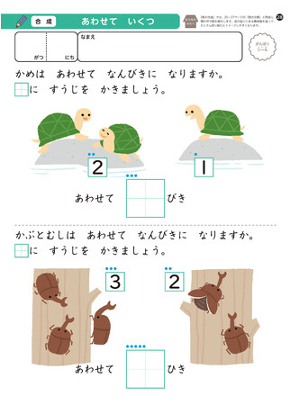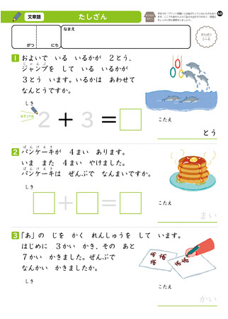 10までのたしひきの考え方を先取りで学習します。イラストをヒントにたす・ひくの意味を理解したうえで、簡単な式にも取り組みます。