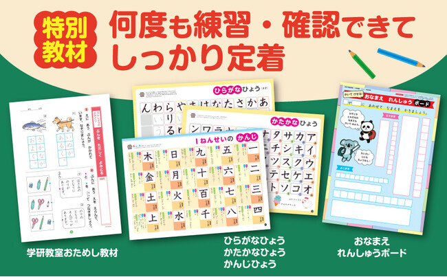 形が単純で覚えやすいひらがなから4段階に分けて学習します。その後、似た形の字を見比べて違いを意識し、徐々に難しい形の字へと学習を進めていく構成です。入学前にひらがなをしっかり完成させます。