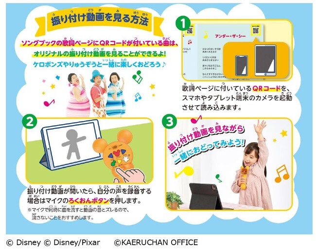 光るマイクでディズニーソングを歌いながら、ケロポンズ&りゅうぞうと一緒に踊れる振り付け動画を楽しめます。