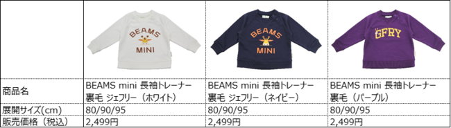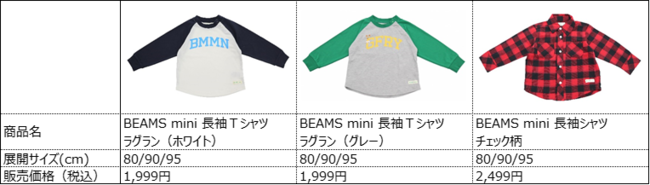 このたび販売を開始する商品は、ボーダーの長袖Tシャツ、チェックシャツ、ラグラン長袖Tシャツやトレーナーのほか、トイザらスの公式キャラクター、キリンの“ジェフリー”をカレッジロゴ風のデザインに取り入れたトレーナーなど、オーセンティックなアメリカンカジュアルウェアのテイストを表現した全13アイテムとなっています。各商品80cm、90cm、95cmの3サイズ展開で販売いたします。ベビーザらスの子ども服ラインナップより、新たな色味とスタイルを提案する『BEAMS miniベビーザらス限定コレクション』をぜひお楽しみください。