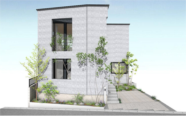 建物正面の道路側に植栽を配し、街並みに溶け込むお家に。プライバシーや防犯性も◎