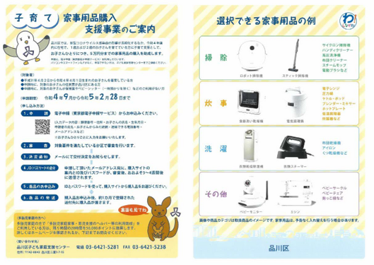 品川区では、新型コロナウイルス感染症の影響が長期化する中、平成31年4月2日から令和4年4月1日生まれのお子さんを在宅で育てている方を対象に子育て支援として、お子さんひとりにつき5万円分までの家事用品の購入を助成します。(令和4年度限定事業)