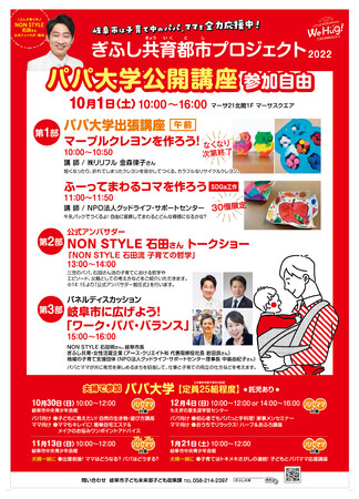 2022年度はNON STYLE石田さんを今回公式アンバサダーに迎え、「ぎふし共育都市プロジェクト」を推進。その活動の一環として、より多くの方にプロジェクトを知っていただくため、NON STYLE石田さんのトークショーを含むパパ大学公開講座を10/1(土)にマーサ21にて開催します。その他、NON STYLE石田さんを交えたパネルディスカッションや、ワークショップ形式の「マーブルクレヨンを作ろう!」「ふーってまわるコマを作ろう」も実施。