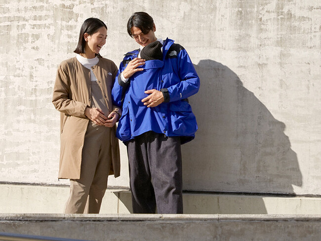 THE NORTH FACEでは、アウトドア製品の開発で培ってきた知見を取り入れたマタニティウェアを2019年10月にローンチ。体形変化の顕著な妊娠中、子どもとの外出が増える産後まで快適に着用できる機能的な仕様やパターンを採用し、機能性と同時に製品のロングライフについても追求してきました。昨年の3月には、産後の育児については男性や女性という枠組みにとらわれないという観点から男女兼用のマタニティレインコートを、8月には抱っこ紐を発売するなど、ユニセックスのアイテム展開を強化しています。今回は更に男性をメインターゲットとし、その視点を大切にするため育児中の男性社員との座談会を実施するなど、父親の育児体験を通じてのリクエスト、視点を製品に反映させました。