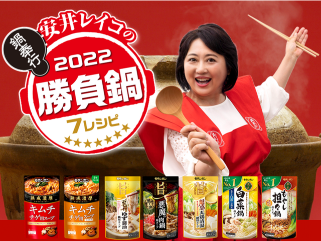 弊社の精肉向け鍋用スープ「コク旨スープがからむシリーズ」は、20年度比で116%と大幅に成長をしています(日経POS 千人当たり金額(全国)9-2月)。これらの背景から定番の鍋料理を今までにないアレンジ・しめ提案することでより家族みんなで食事を楽しめるきっかけになるような施策をしたいと考えました。そこで鍋料理の「簡単で野菜がたくさん摂取でき、温まる」といった価値に+αの魅力で更に鍋料理の価値を高めるため、市販鍋の素を6,000以上制覇した女王としてTVなどのメディアで引っ張りだこの料理研究家安井レイコさんとコラボ企画が実現。「安井レイコの2022勝負鍋7レシピ」と題し、しめまで楽しむ鍋提案を行い鍋料理の無限大の可能性を追求します。