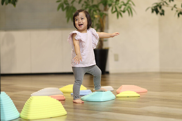 バランスストーンは川の中の石を飛び移っていく遊びをイメージしています。簡単に自宅の中をアスレチック空間に変身させてくれる便利アイテムで、運動不足解消にもぴったり。自然と遊びながらバランス感覚や体幹を鍛えることができます。また、遊び方を理解すると、自分で考えて並べてみるなど、お子様自ら率先して遊びたくなるトレーニング玩具です。