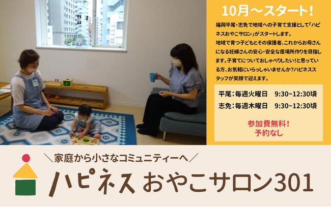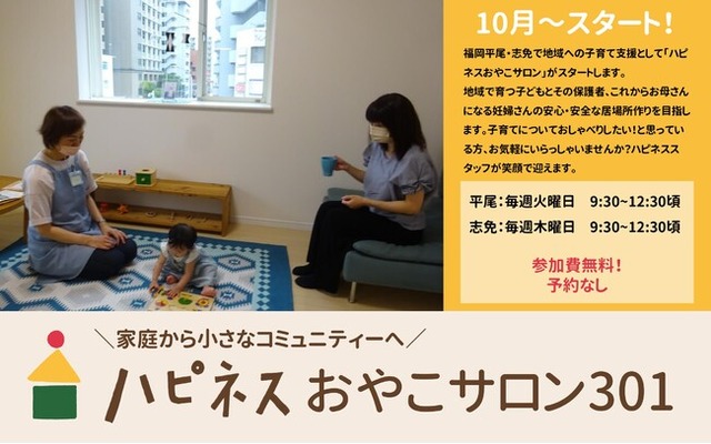 アイリンクス株式会社(本社:福岡市博多区、代表取締役社長:石井 清悟)が運営するハピネス保育園(福岡市中央区平尾、福岡県糟屋郡志免町、園長:平野理都子)は、2022年10月より子どもたちが安心して育つ環境つくりと子育て中のパパ・ママの支援を行うために、親子が集う場所の提供を行う「ハピネスおやこサロン301」を開始。