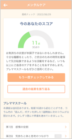 本機能は、質問に答えることで自身の精神状態を可視化する「メンタルチェック(エジンバラ質問票※1)」や、妊産婦のメンタルヘルスを学べる「プレママスクール」など、妊娠中や産後のココロの不調に対して、正しい知識を学ぶことで自身で適切に対処したり、一人で抱え込まず相談するなどのアクションを起こせるようサポートします。