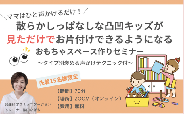 初めまして、子どもが「見てわかる!」リビングで、ママの声がラクラク届くようになる、子育て講座「発達科学コミュニケーション×脳育ハウスメソッド」をお伝えしています仲田なぎさと申します。この度「散らかしっぱなしな発達凸凹キッズが自分から片付けできるようになるおもちゃスペース作りセミナー開催~タイプ別褒める声かけテクニック付~」無料オンラインセミナーを、9/16,20,21に開催いたします。