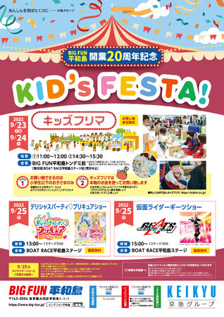 京急開発株式会社(本社:東京都大田区 取締役社長:渡辺静義)では、自社で運営する複合商業施設「BIGFUN平和島」の開業20周年記念のラストを飾るイベントとして、9月25日(日)に「デリシャスパーティ(ハート)プリキュア」・「仮面ライダーギーツ」のステージショーを開催いたします。なお、2022年9月23日(金祝)~25日(日)の3連休をキッズフェスタとし、2022年9月23日(金祝)・24日(土)の2日間は体験型教育イベント「キッズフリマ」を開催いたします。
