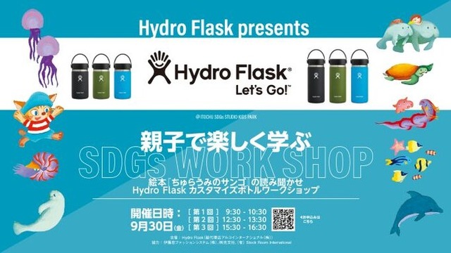 SDGsをテーマにした4つのオリジナルエリア、SDGsを通じる玩具や絵本などが置いてあり、イベント終了後も利用できるそう。Hydro Flask(R)は、ボトルに『ちゅらうみのサンゴ』に登場するキャラクターの生分解性ステッカーを貼って楽しむ事ができる、ワークショップ形式でのカスタマイズボトル体験を開催!