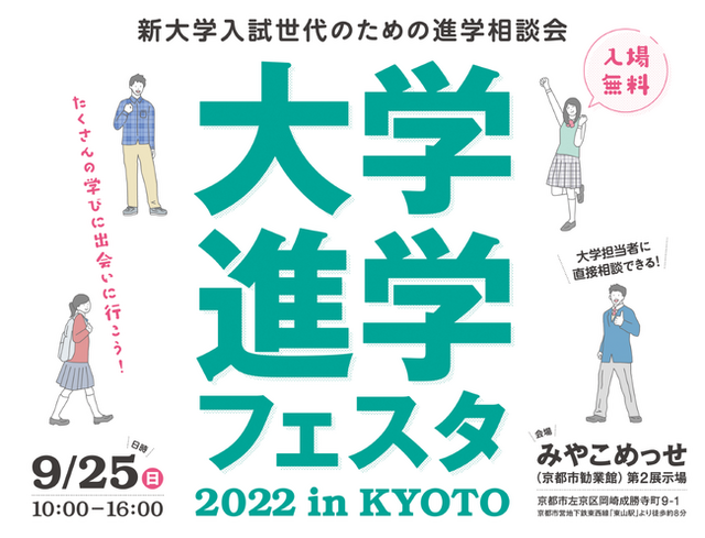 京都新聞(本社・京都市中京区)は、9月25日(日)、大学進学フェスタ2022 in KYOTOを、みやこめっせ(京都市勧業館、京都市左京区岡崎成勝寺町)で開催します。これから大学入試を迎える生徒・保護者の皆さんを対象に、地元京都のほか、関西、首都圏などから資料参加を含め60以上の大学が参加する進学相談会です。入試のほか大学の特徴や大学生活などを、大学担当者に直接質問できる機会です。「大学入試の基礎知識」や「2023年度入試動向」などをテーマにした講演会も実施しますので、入試や学習についての疑問や不安を解消する場としていただけるよう、ぜひご参加ください。