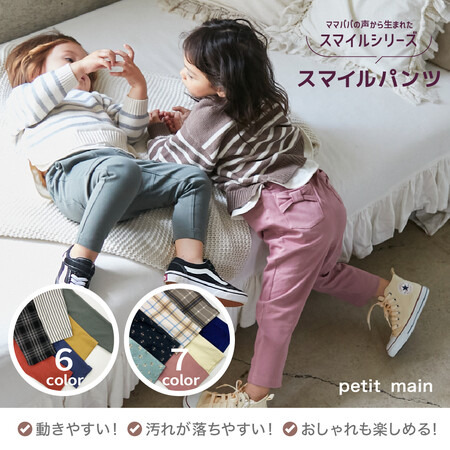 「petit main(プティマイン)が展開する「スマイルシリーズ」は、ママ・パパの声を元に「子どもにうれしい快適素材」+「季節・用途に合わせた機能性」を軸に企画した、キッズ・ママ・パパみんなが笑顔になるキッズ服シリーズです。