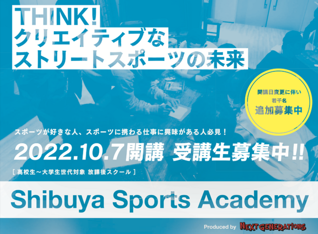 一般社団法人渋谷未来デザイン(代表理事:小泉秀樹、以下、渋谷未来デザイン)は、ログス株式会社(代表取締役社長:武田悠太)が運営する10代のための新たなクリエーションの学び舎「GAKU」と連携し、Shibuya Sports Academy 第3期を2022年10月7日(金)に開講します。
