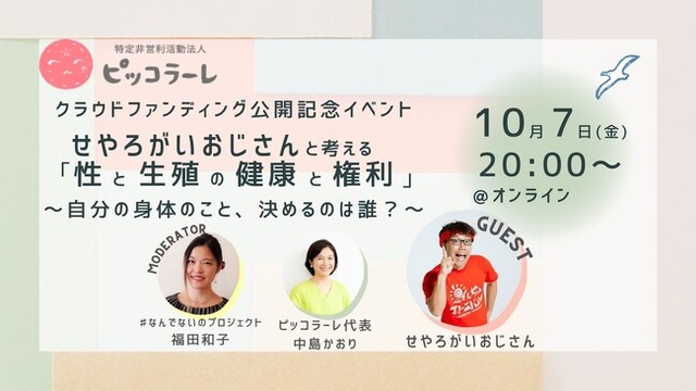 今回のイベントでは、特別ゲストにせやろがいおじさんをお招きし、モデレーターの福田和子さん、ピッコラーレ代表の中島かおりと一緒にSRHRについて考えます。