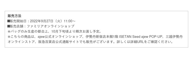 株式会社ファミリア(所在地:神戸市中央区、代表取締役社長 岡崎忠彦)は、株式会社PARK CREATION(所在地:大阪府大阪市、デザイナー兼代表取締役 新井愛子)が手がけるバッグ・スマホケースブランド「ajew(エジュー)」との限定コラボレーションアイテム第2弾を、2022年9月27日(火)よりファミリアオンラインショップにて販売いたします。