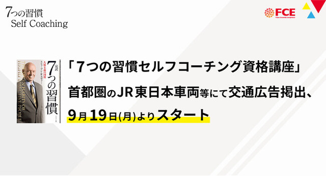 世界的ベストセラー『7つの習慣』出版社である株式会社FCE パブリッシング(本社:東京都新宿区、代表取締役:正木晃、以下FCEパブリッシング)は、2022年9月19日から9月25日までの7日間、首都圏のJR東日本及びりんかい線、つくばエクスプレスの車両にて、自分で自分を成長させるVUCA時代の自己対話スキル「7つの習慣セルフコーチング資格講座」に関する交通広告を掲出いたします。働き方などが変わり、これまで以上に「個の力」の向上が求められる「この時代」に必要な教育や人材育成、ビジネスパーソンとしてのあり方とは何か?について問いかけるメッセージ広告となります。