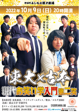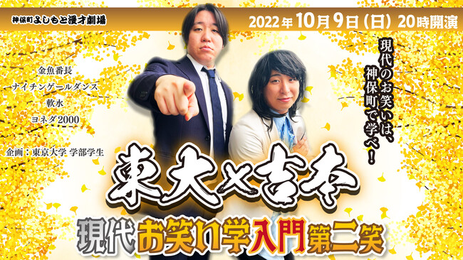 その第3弾では、10月9日(日)に、現役東大生がプロデューサー、芸歴4年目の金魚番長を中心とした彼らと同世代の吉本興業所属の若手芸人が出演者となり、自由な発想で共同の寄席を考案する、体験プログラムから生まれたライブ、「東大×吉本 現代お笑い学入門 第二笑」を実施します。