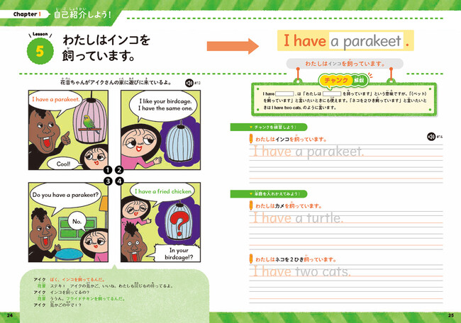 本書では“I love pizza.(わたしはピザが大好きです。)”、“I have a parakeet.(わたしはインコを飼っています。)”など、小学生が実際に使いたいと思うような身近で基本的な表現「チャンク」を、アイクぬわらさん・花音さんが繰り広げる4こまマンガのストーリーを通じて学ぶことができます。