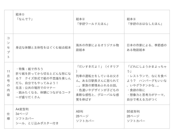 4~5歳向けとして2022年9月号からスタートし、9月16日(金)から11月号の受付を開始しました。それぞれの本の特長と11月号の内容は表のとおり。