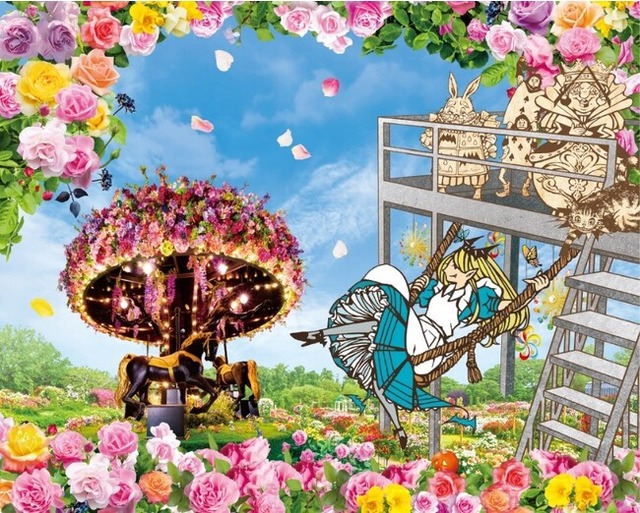 バックにはバラの庭園!アリスの世界観にデコレーションされた花のブランコ「アリスのブランコ」